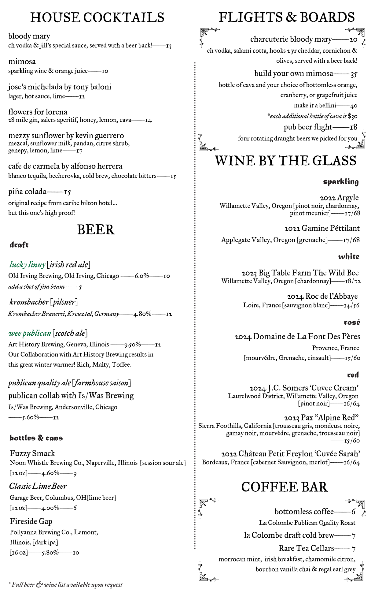 Please inform your server of allergies or dietary restrictions as menu items contain ingredients that are not listed.